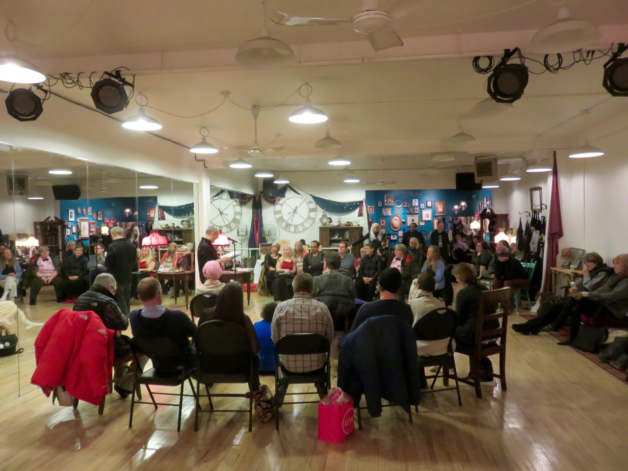 Categories events KFBFridays poet poetry reading splendid Surrealist extravaganza Post author By Kirby Post date January 6, 2018 1 Comment on Surrealist extravaganza SHANNON MAGUIRE DAVID BATEMAN ROBERT PRIEST BEATRIZ HAUSNER SHERI-D WILSON hold court to a full house of hardy poets, “the coldest January 5th on record.” Where were the poets? Keeping the hearth. knife | fork | book KFB UPCOMING: JAN 9 KFB | KIRBY ‘DORIS’ IN OTTAWA |TREE READING SERIES | MARGO LAPIERRE JAN 12 SLO-PO w/ DAVID BRADFORD (reading JERICHO BROWN THE NEW TESTAMENT) JAN 19 SHANNON BRAMER | CATHERINE GRAHAM | JESSICA HIEMSTRA JAN 25 KFB at CROSSROADS LIT FEST | YORK U JAN 26 GARRY THOMAS MORSE | SONIA DI PLACIDO Photos: KIRBY Share this: Click to share on X (Opens in new window) X Click to share on Facebook (Opens in new window) Facebook Click to share on Tumblr (Opens in new window) Tumblr Click to share on Pinterest (Opens in new window) Pinterest Click to print (Opens in new window) Print Click to email a link to a friend (Opens in new window) Email Like Loading... Tags beatrizhausner, bookshop, davidbateman, extravaganza, kfb, knifeforkbook, lastnight, poetry, poets, robertpriest, shannonmaguire, sheridwilson, surrealist, toronto By Kirby Poet. Book Fairy. Publisher knife | fork | book View Archive → ← JANUARY MO PO → Winter break One reply on “Surrealist extravaganza” […] Poets are a hardy bunch. […] LikeLike Leave a comment Cancel reply Δ This site uses Akismet to reduce spam. Learn how your comment data is processed.