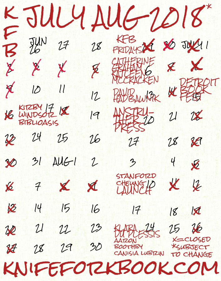 Categories events KFBFridays launch new poet poetry reading splendid summer “Summertime… Post author By Kirby Post date June 25, 2018 No Comments on “Summertime… “and the living is” knife | fork | book Please note red x’s mark days we are closed, otherwise open Tues-Sat 1-5:30PM Also, schedule is subject to change, (and does), check back here and on twitter for the latest updates. Share this: Click to share on X (Opens in new window) X Click to share on Facebook (Opens in new window) Facebook Click to share on Tumblr (Opens in new window) Tumblr Click to share on Pinterest (Opens in new window) Pinterest Click to print (Opens in new window) Print Click to email a link to a friend (Opens in new window) Email Like Loading... Tags 244Augusta, allpoetry, bookshop, kensingtonmarket, KFBFridays, poetry, poets, poweredbypoets, schedule, summer, thedarksidestudio, toronto By Kirby Poet. Book Fairy. Publisher knife | fork | book View Archive → ← On the nightstand → You can take her anywhere Leave a comment Cancel reply Δ This site uses Akismet to reduce spam. Learn how your comment data is processed.