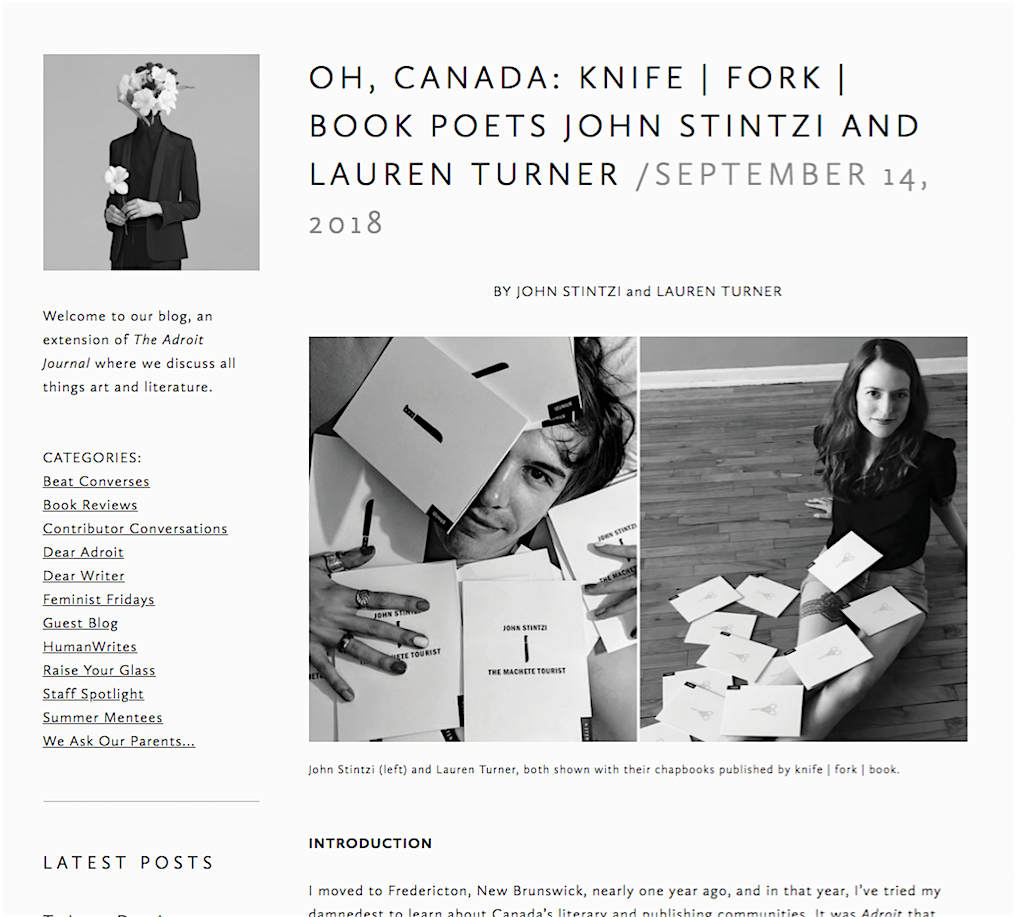 Both Stintzi and Turner recently published chapbooks with knife | fork | book, a poetry-only small press and bookstore in Toronto. I had the privilege to visit k | f | b in June, and I am so excited to give it—alongside its owner, Kirby, a CanLit institution—some much-deserved attention in the States.