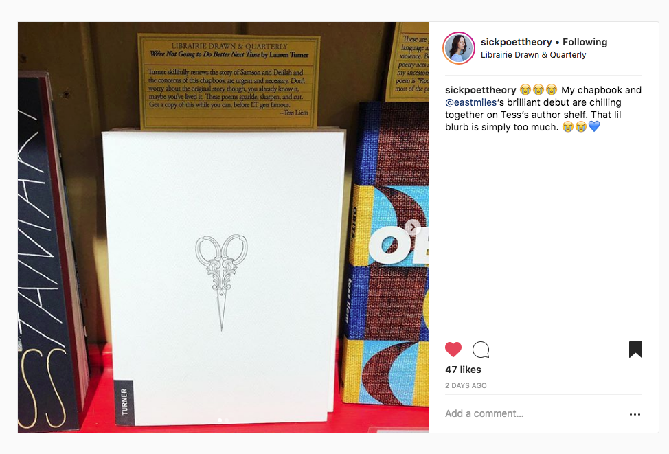 Turner skillfully renews the story of Samson & Delilah and the concerns of this chapbook are urgent and necessary. Don’t worry about the original story though, you already know it, maybe you’ve lived it. These poems sparkle, sharpen, and cut. Get a copy of this while you can before LT gets famous. – TESS LIEM
