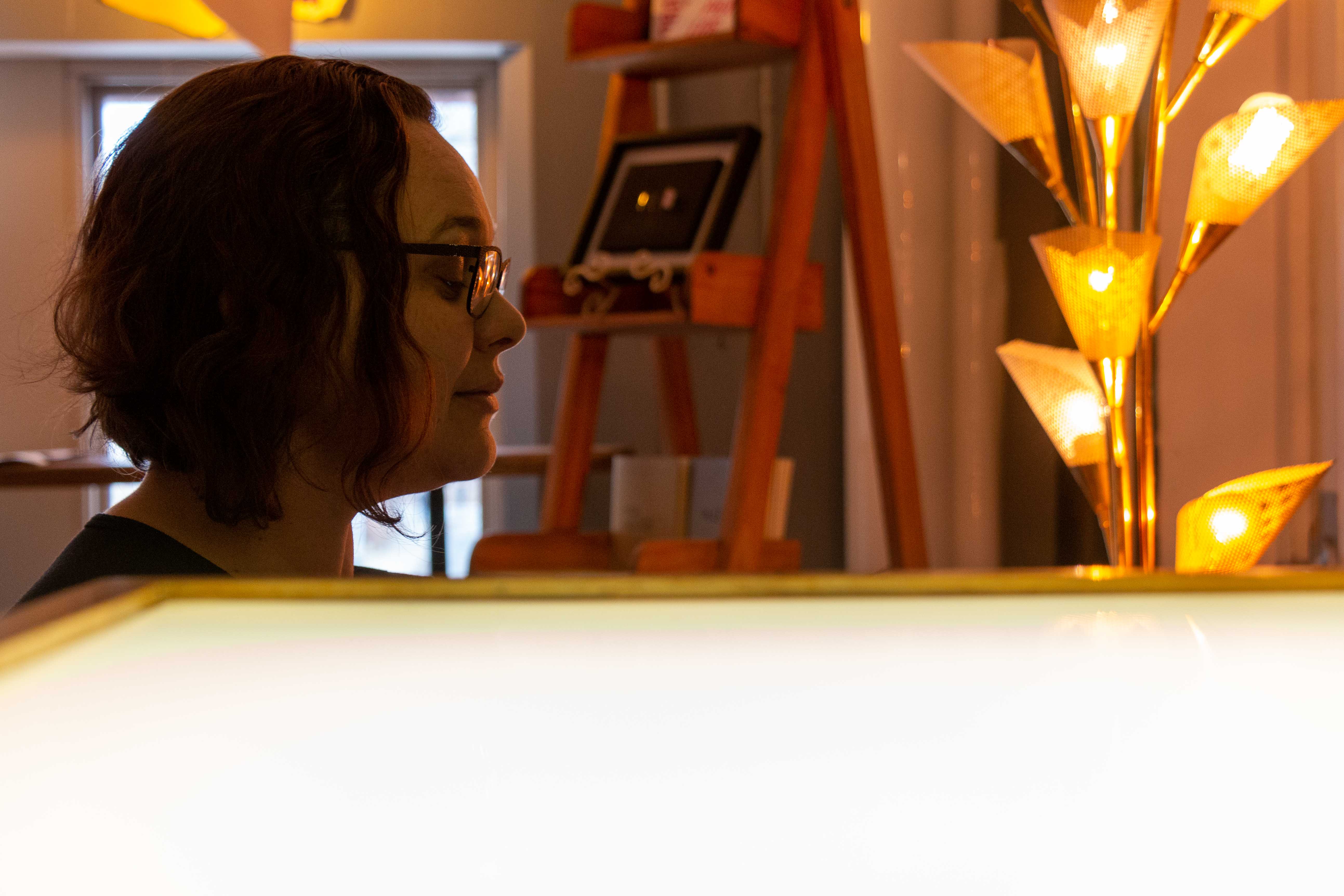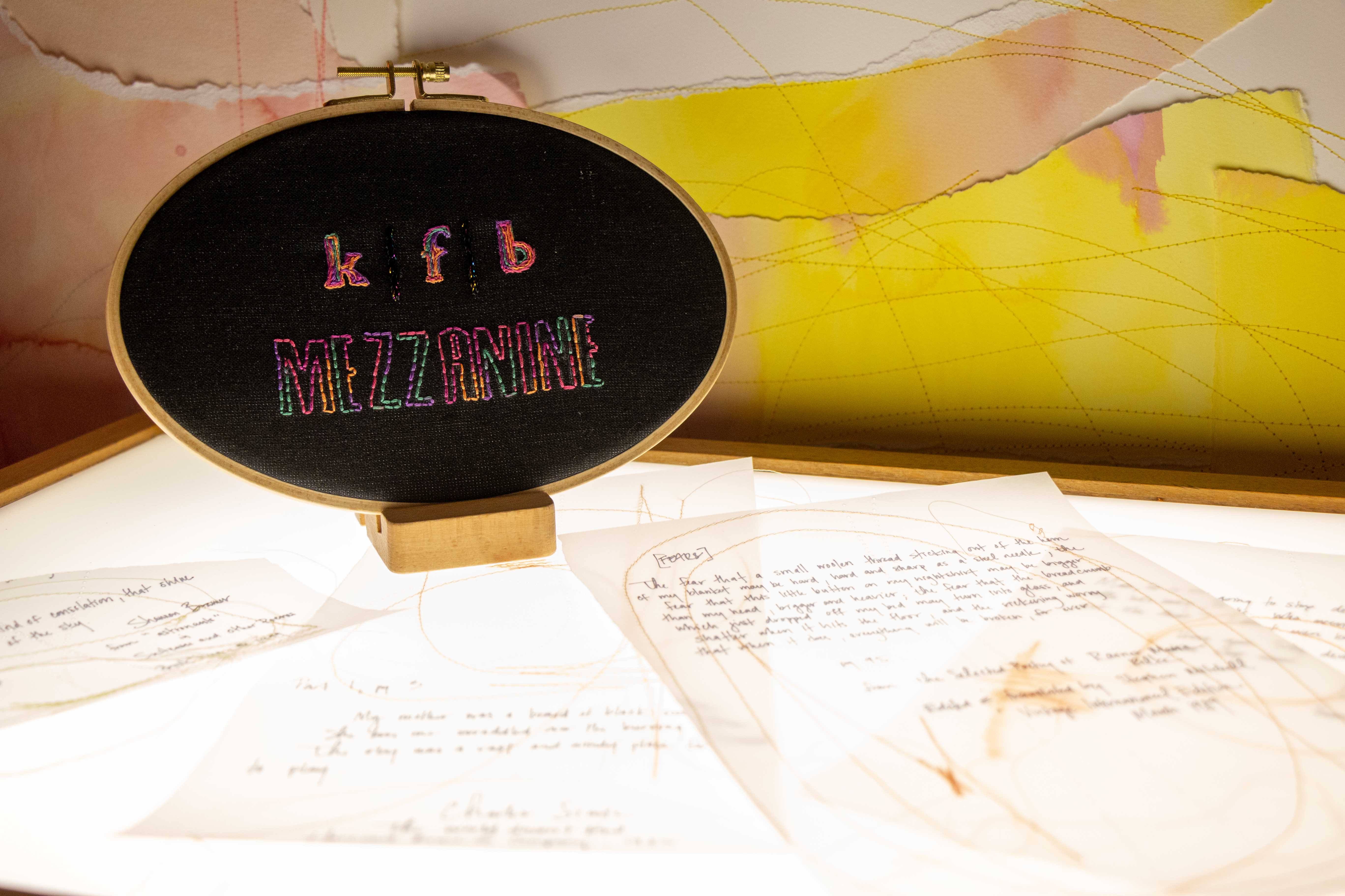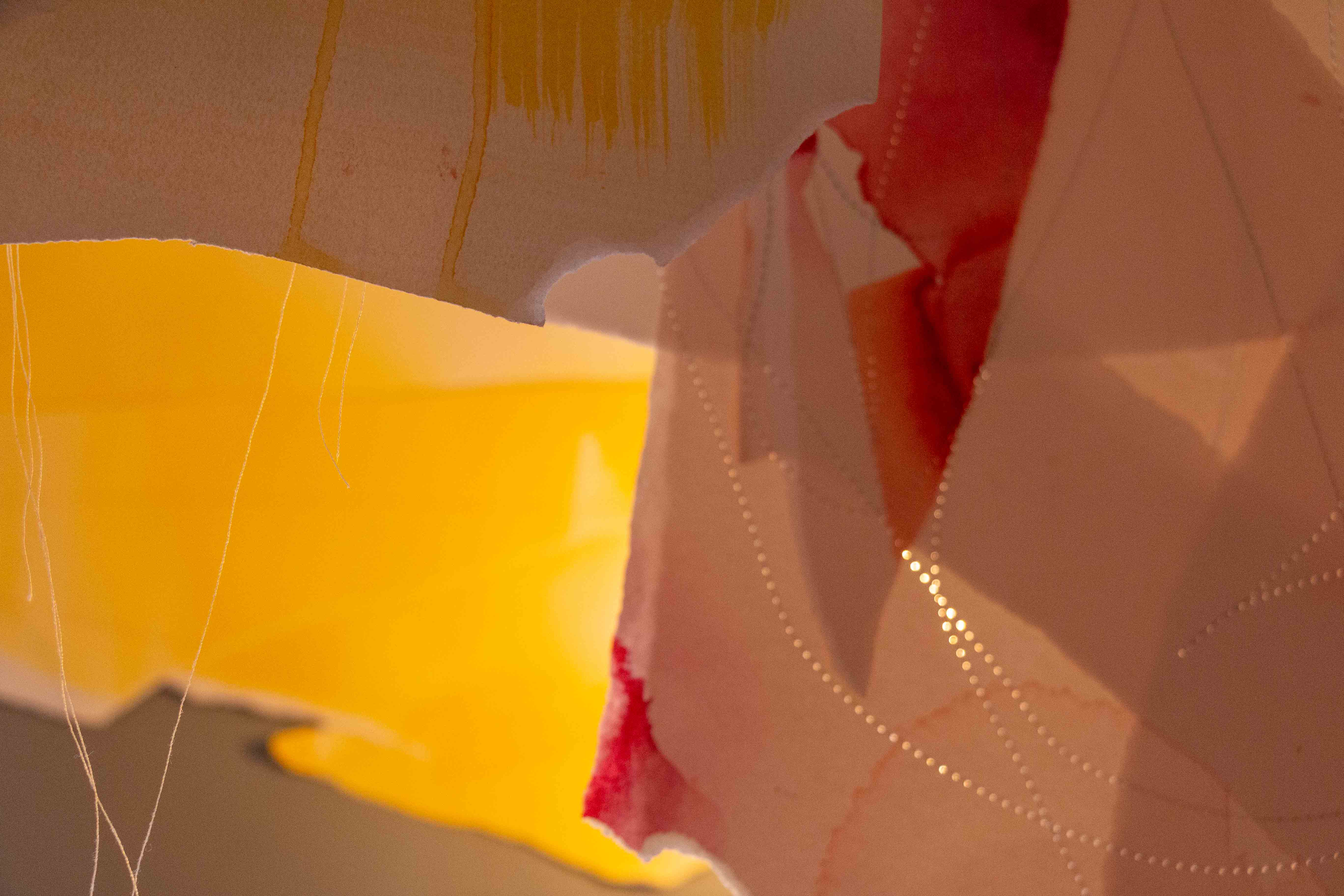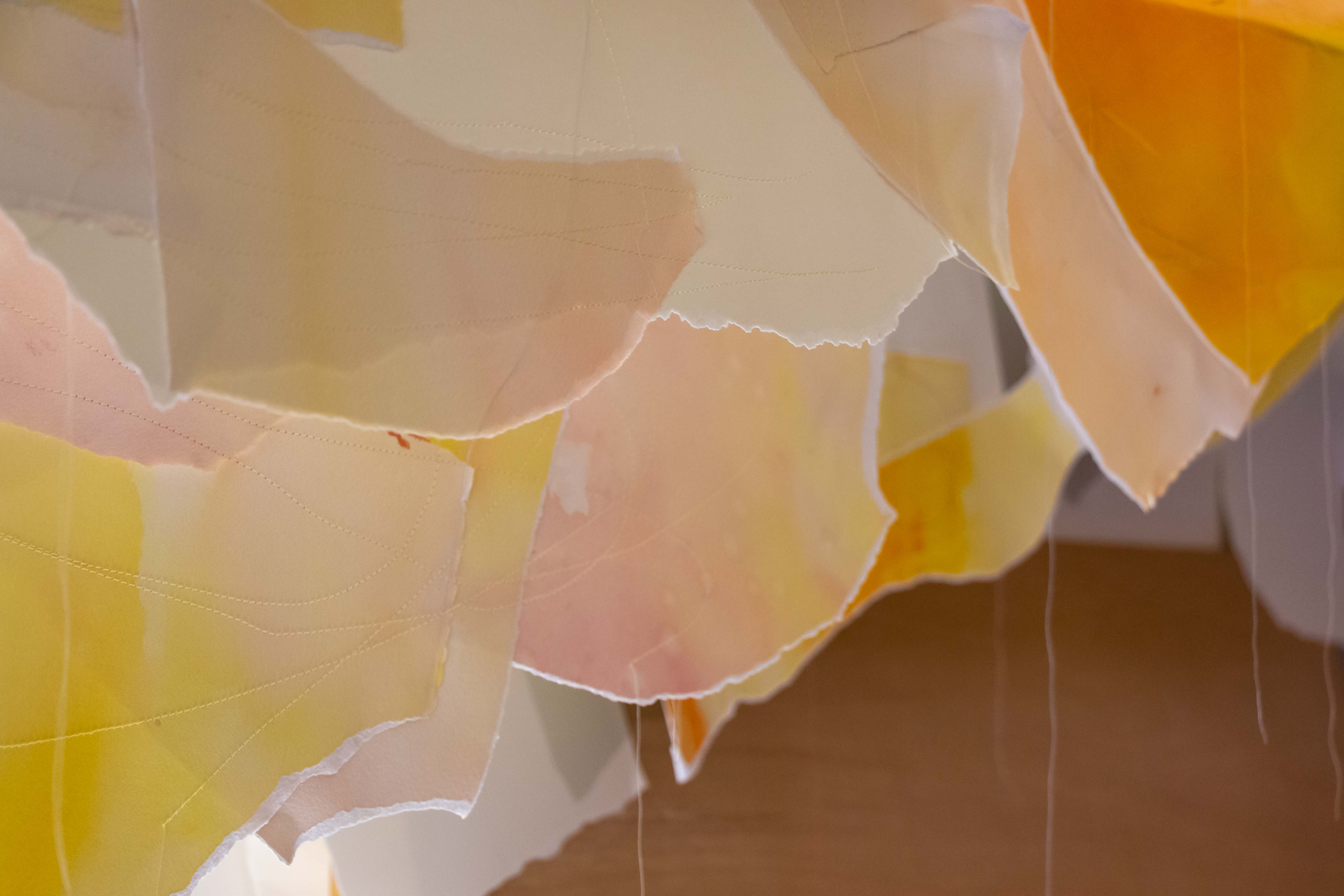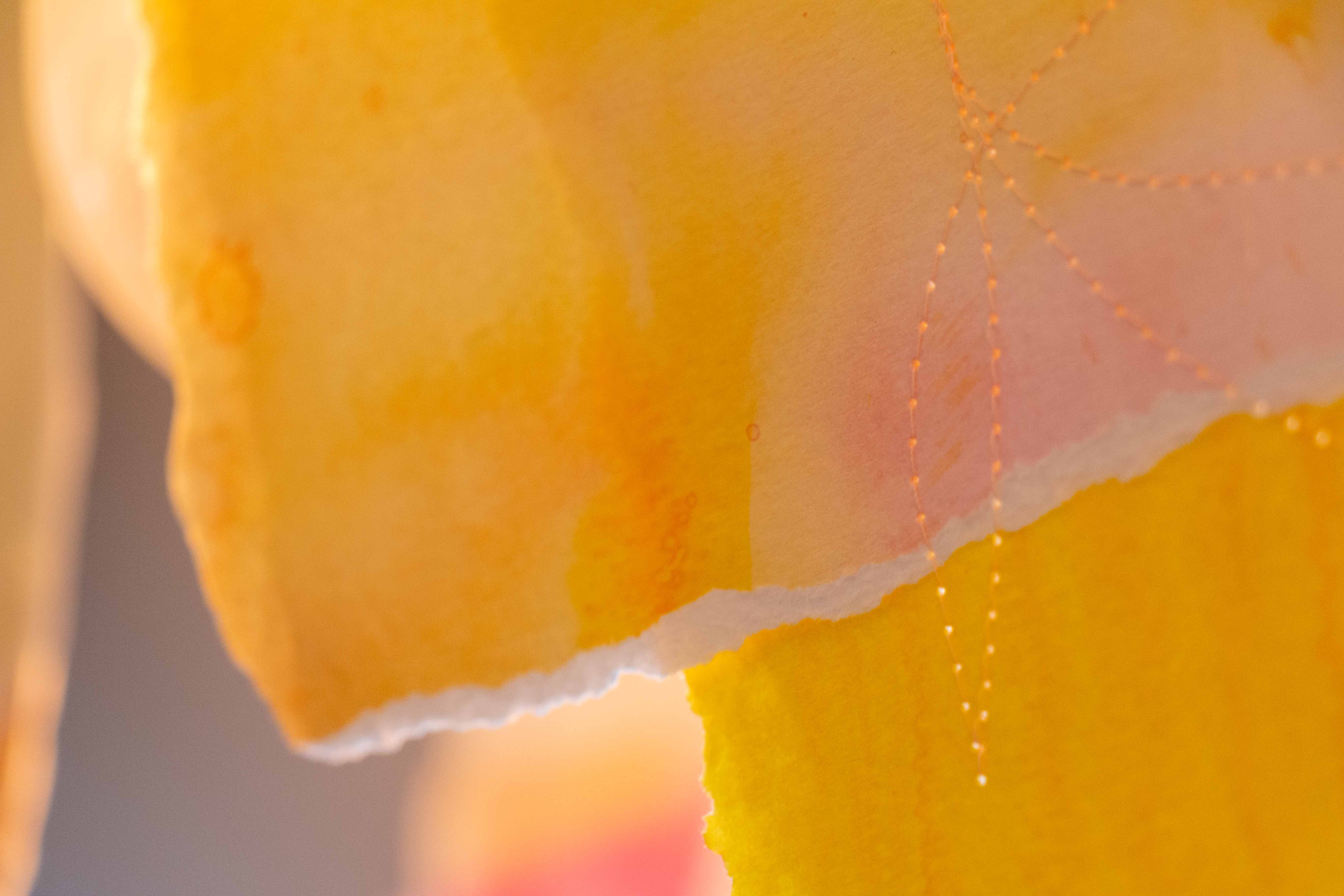 Hiemstra creates an abstracted paper sky on the ceiling of Canada’s only all-poetry bookstore, Knife Fork Book. Using watercolour paper, thread and washes of Genzäh Handmade Watercolours paint, Hiemstra’s sky is one that is torn and sewn back together. This sky has tangled stitching, punctures, long dangling threads, and fragments of poetry sewn into it. Independent bookstores and especially those that specialize in theatre, poetry, music and art are becoming rarer and rarer. Knife Fork Book is an ephemeral place. It continues to exist because its sky continues to be held together by delicate threads.