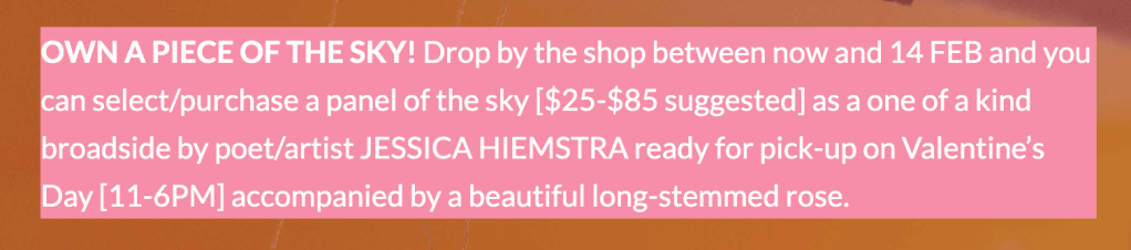 Visual artist, designer and poet Jessica Hiemstra creates an abstracted paper sky on the ceiling of Canada’s only all-poetry bookstore, Knife Fork Book. Using watercolour paper, thread and washes of hand-made Genzah watercolour paint, Hiemstra’s sky is one that is torn and sewn back together. This sky has tangled stitching, punctures, long dangling threads, and fragments of poetry sewn into it. Independent bookstores and especially those that specialize in theatre, poetry, music and art are becoming rarer and rarer. Knife Fork Book is an ephemeral place. It continues to exist because its sky continues to be held together by delicate threads.
