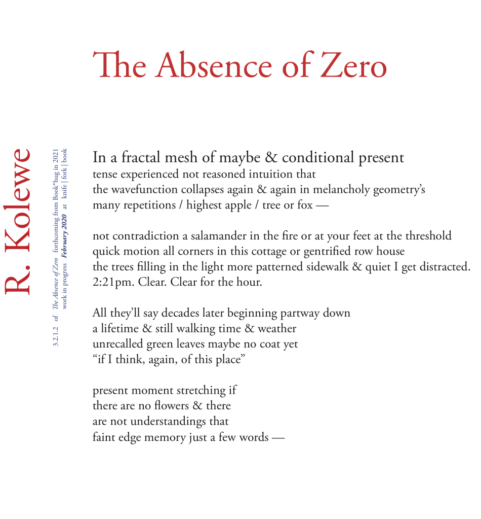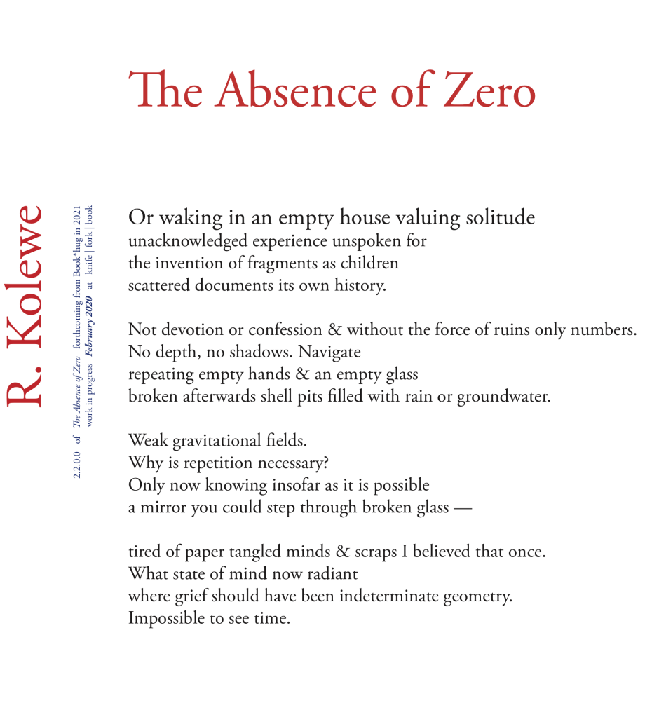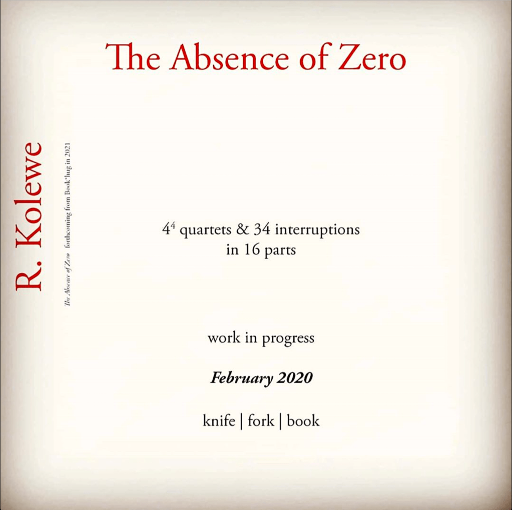 Starting Tuesday February 4, 7:00pm at knife | fork | book and continuing for one evening each of the next three weeks, R. KOLEWE will be reading through The Absence of Zero, a long poem about time, memory, loss, and the continuing mess of the long 20th century, which will be published in 2021 (Book*hug).
