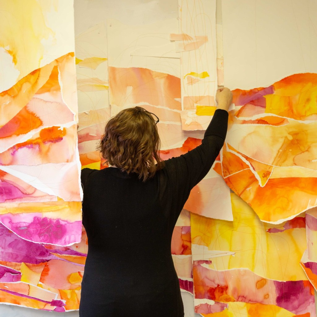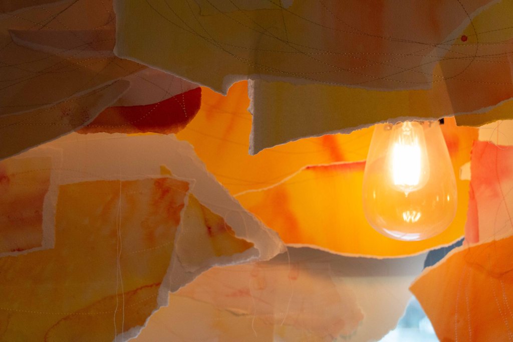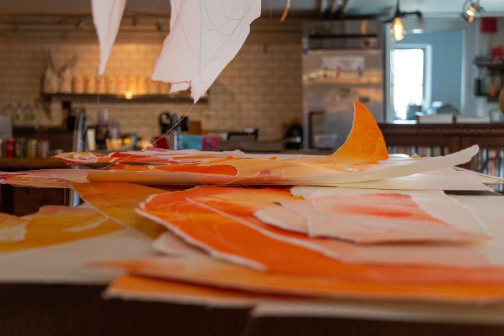 THIS FRIDAY FEBRUARY 14 JESSICA HIEMSTRA’s beloved DesignTO Festival installation (and love-letter to poets), The Sky is Falling, is coming down. Jessica will be on site at Knife Fork Book, Canada’s only ALL POETRY bookstore, 11AM-6PM, removing the watercolour sky, piece by piece. Fragments of the sky will be on sale for $25-$85; Jessica will stitch and pin poems into the panels as they are removed from the ceiling. For the first 30 people, there will also be roses. If you have a love-poem you want written out, if you want a piece of the sky to be your love-poem, if you want to give yourself a piece of sky, please come: the sky is yours.