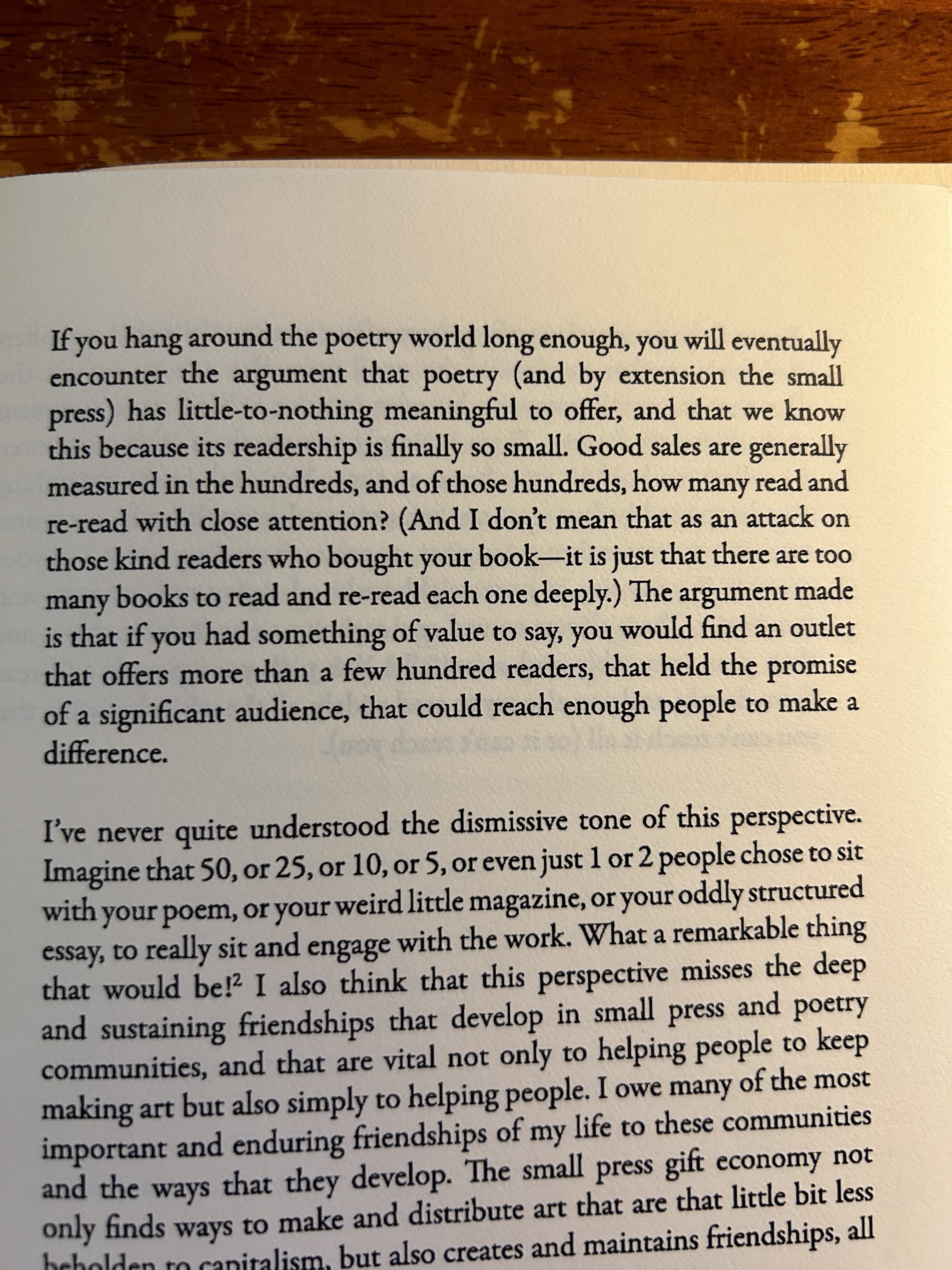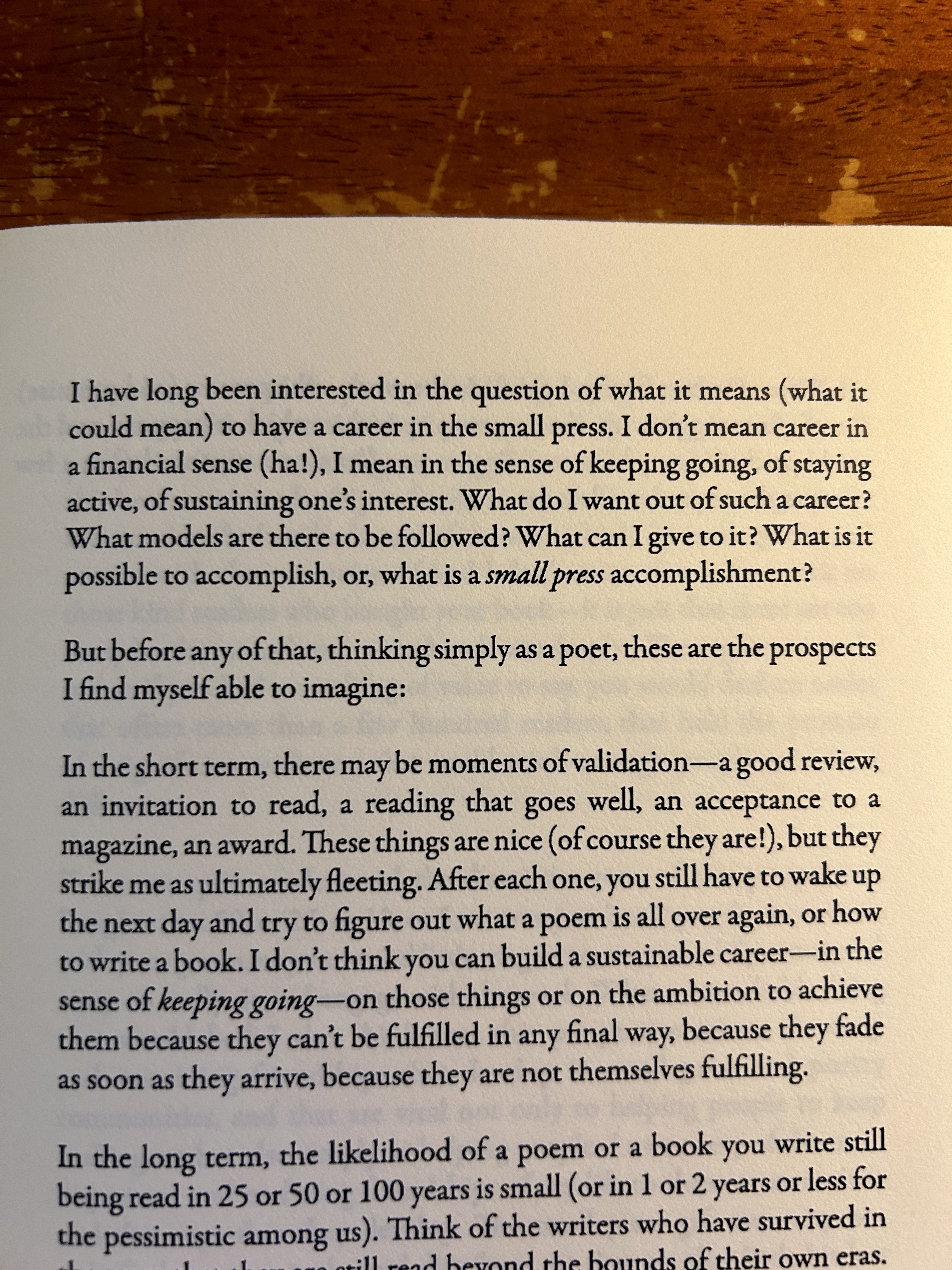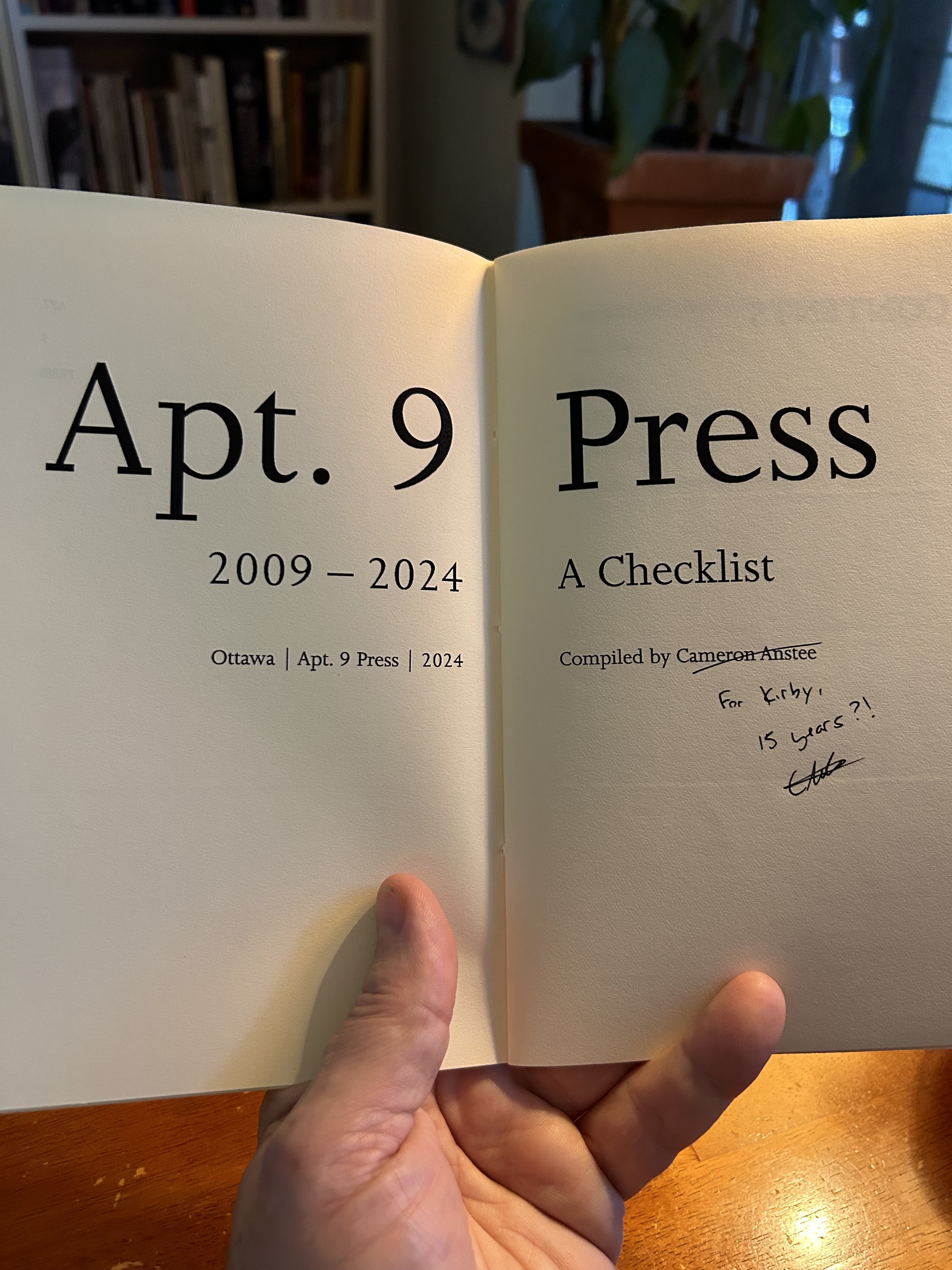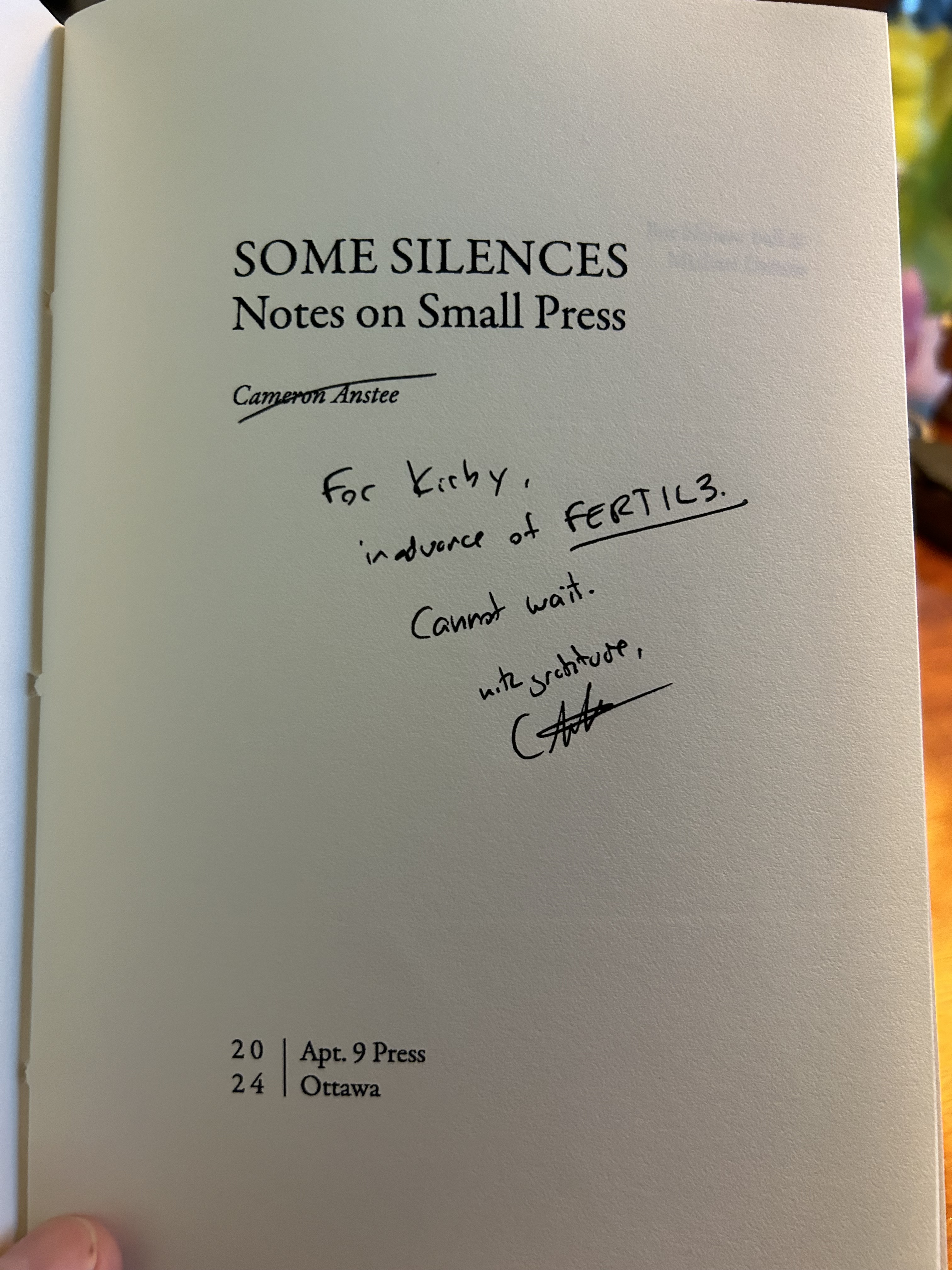 To keep going, you need to feel you are making good work—or moving in the direction of making good work, or interesting work, or are interested in the work you are making—and see that as the thing you are aiming to do. Anything good that happens beyond is a bonus…” Cameron Anstee, Some Silences: Notes on Small Press (Apt. 9 Press, 2024.)