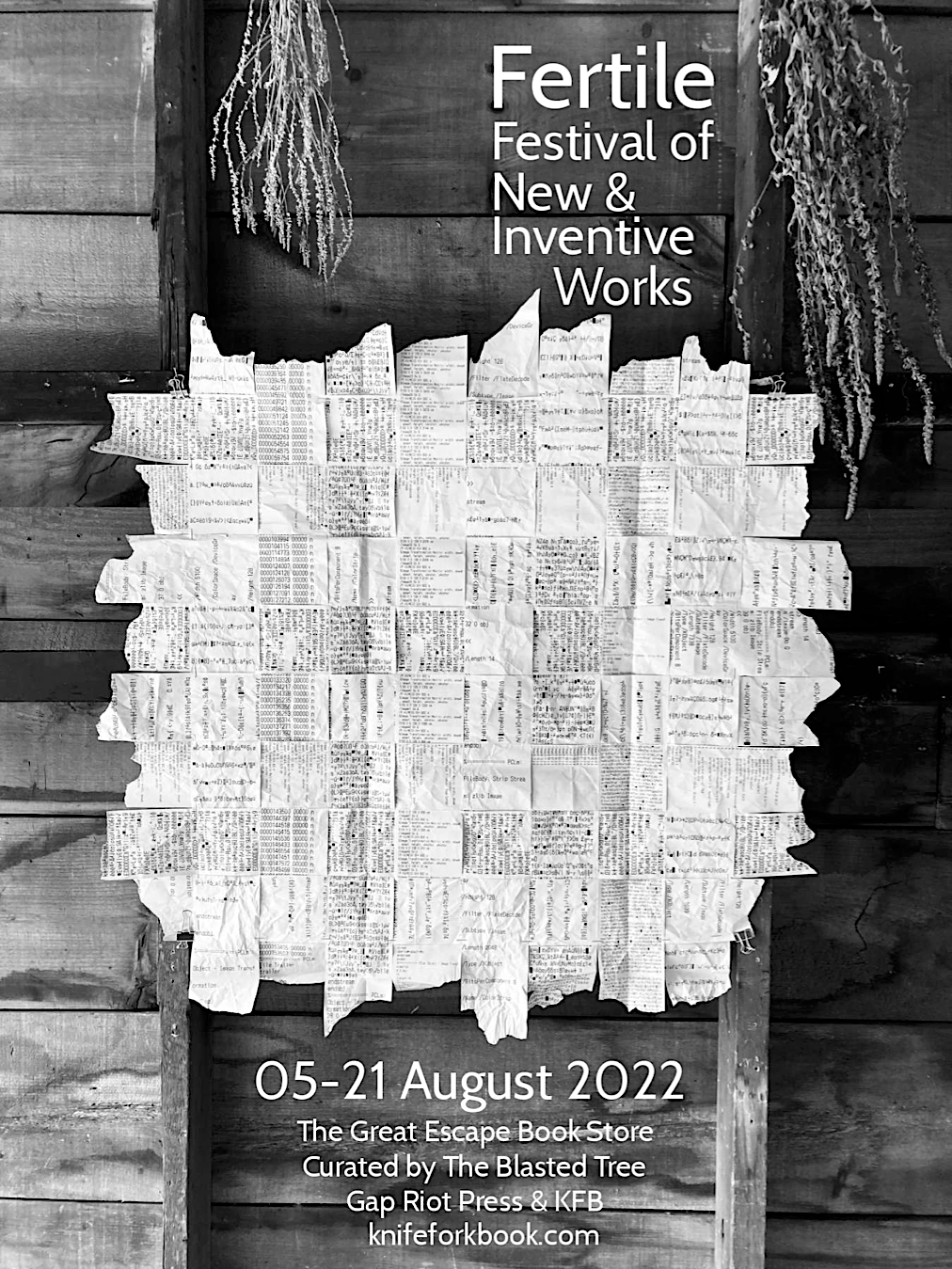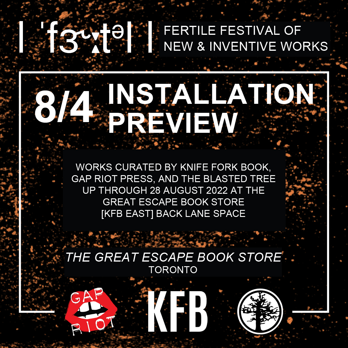 04 AUG FERTILE INSTALLATION PREVIEW Works curated by all three presses up through 28 August 2022 at The Great Escape Book Store [KFB EAST] Back Lane Space*